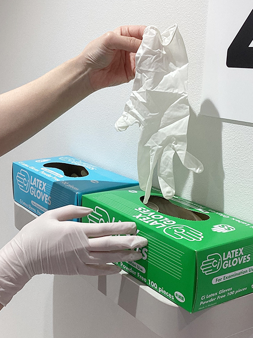 診療台の横に常備しており、こまめに変えられるようにしています。グローブを外した後、つける前、交換する際には手指消毒を行い、感染拡大防止の徹底を行っています。