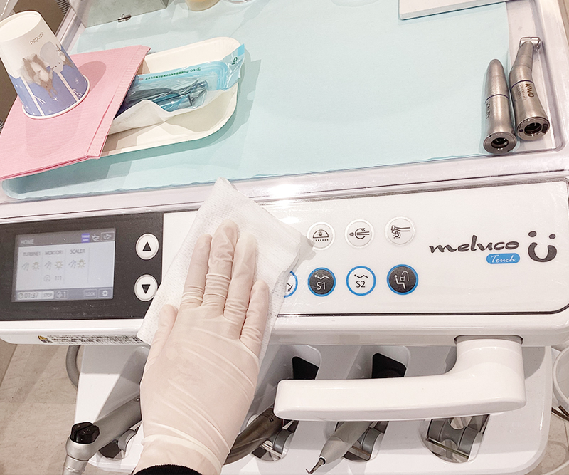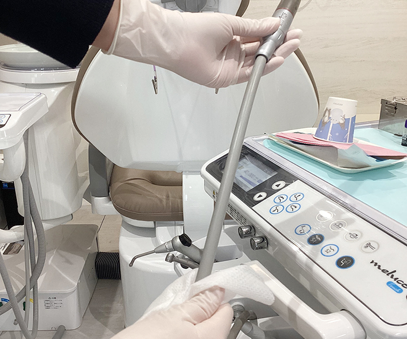 患者さんが座る診療台、バキュームホース、ライトハンドル、タッチパネルなど、血液や体液が付着する部分、術者が触れ得る全ての場所を、1人の患者様の診療を終えるごと毎回清拭しています。