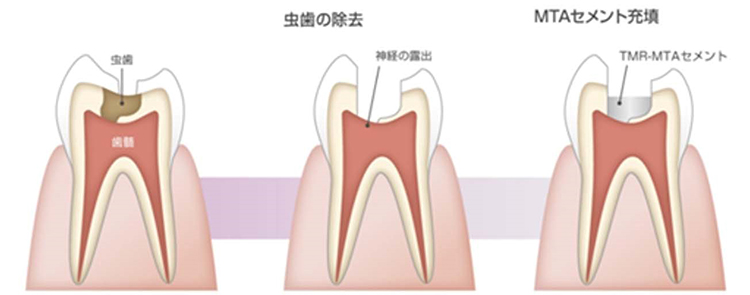 VPT(歯髄温存療法)とは、むし歯と感染している神経の一部を完全に取り除き、露出した神経に対して保護するセメントをつめて神経を残す治療です。神経を残すことは、歯の寿命を延ばすことにつながります。