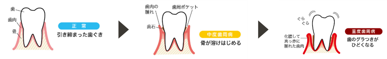 歯周ポケットがかなり深くなり、顎の骨は半分以上溶けて歯は大きくグラグラします。膿や口臭、痛みも強くなり、さらに悪化すれば歯は抜け落ちてしまいます。